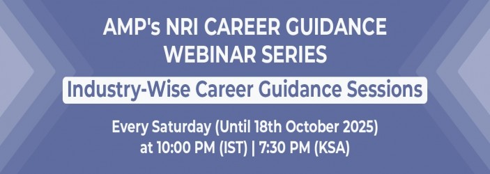 Association of Muslim Professionals (AMP) is organizing a 12-Day Industry-Wise Career Guidance Webinar Series Specially for NRIs (Non-Resident Indian) As the world advances rapidly across industries, Association of Muslim Professionals (AMP) brings you a 12-week industry-wise career guidance webinar series.