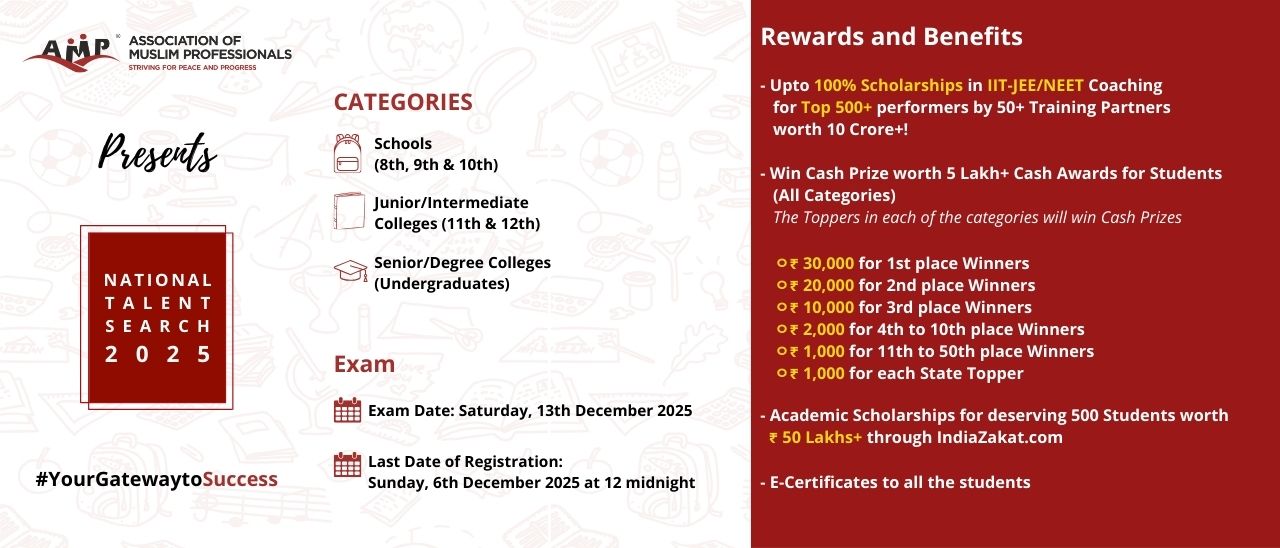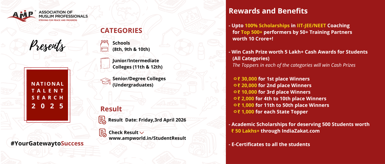 Association of Muslim Professionals (AMP) has been actively working since 2007 in the areas of Education, Employment Assistance, and Economic Empowerment for the Community and the Nation. With the aim of enhancing students’ general awareness and fostering a spirit of healthy competition, AMP launched a nationwide competition National Talent Search (NTS) in November 2020.