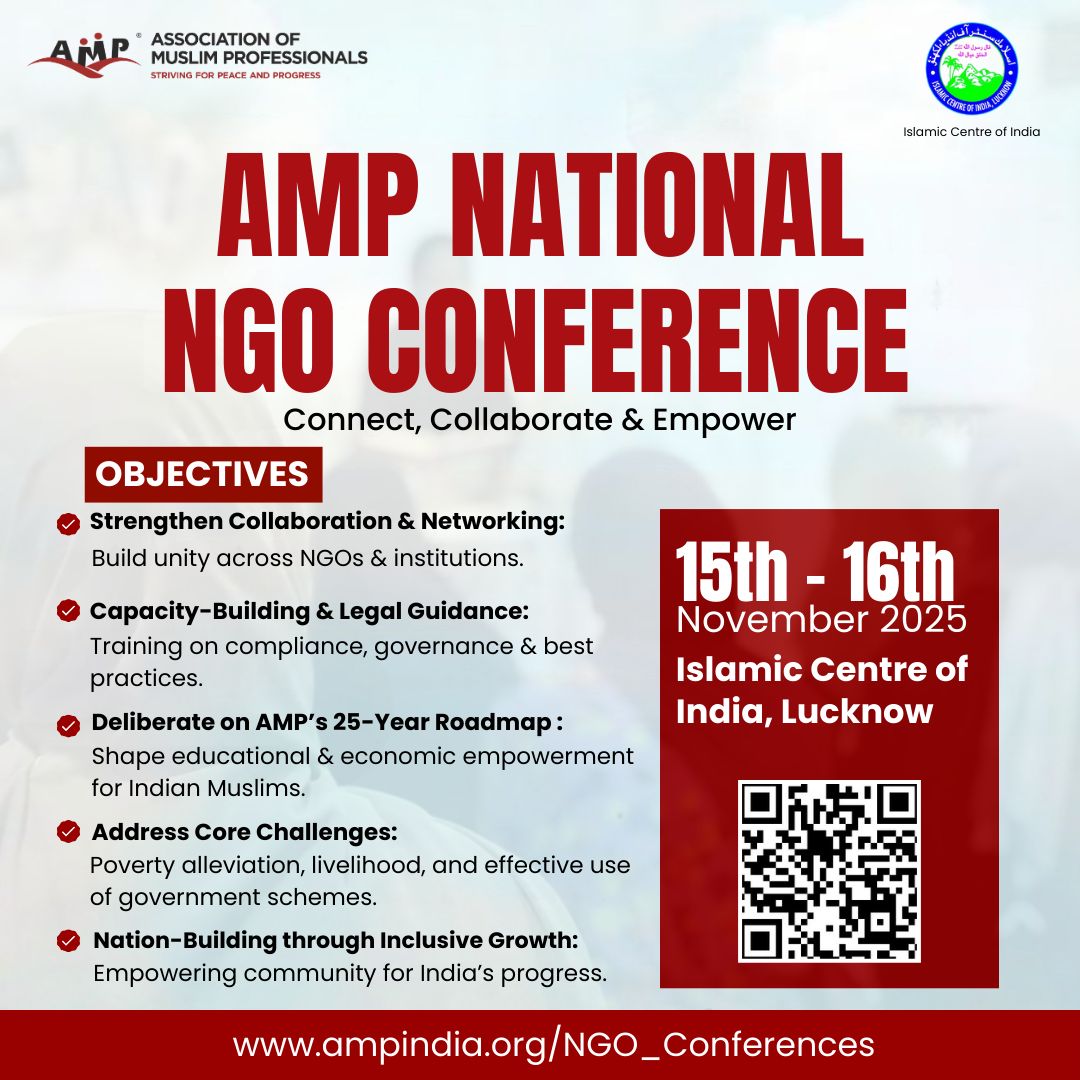 Social leaders are the face and strength of any community. Their organizations (NGOs) play a transformative role in shaping an equitable society — lifting people from despair into hope, dignity, and empowerment. AMP is now organising the National NGO Conference 2025 on 15th & 16th November, in Lucknow, bringing together Leaders, Intellectuals, Policymakers, and grassroots NGOs to chart a collective path for Community Development and Nation-Building. Over 1000+ NGOs and social organizations from across India are expected to participate, making this one of the largest gatherings for collaborative social action.